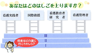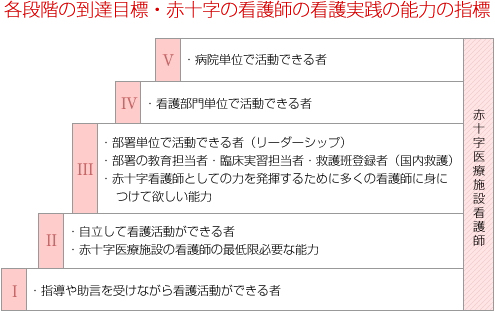 全国の赤十字医療施設では看護師の看護実践能力向上のしくみとして「キャリア開発ラダー」を導入しました。この「キャリア開発ラダー」は、赤十字のネットワークを活用したキャリア開発を行うことで、より専門性の高い赤十字事業の推進者としての人材育成を行うことを目標にしています。
