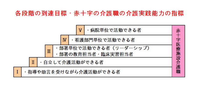 当院では、平成22年に「赤十字介護職キャリア開発ラダー」を用いた実践能力評価プログラムを作成し、能力開発に活用しています。 赤十字の理念に基づいた「赤十字の介護職の介護実践能力」の到達目標を段階的に示し、その到達を目指すことにより、質の高い介護を提供できる介護職の育成を図っています。 新人の頃から将来自分がどのような介護職になりたいのかを見据えながら、赤十字医療施設に求められる人材へと成長していって欲しいと思っています。