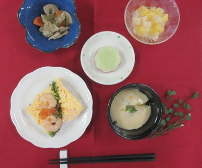 入院・入所生活の中で食事は大きな楽しみのひとつと言えるでしょう。温冷配膳車を使用し、温かい料理は温かく、冷たい料理は冷たい状態で提供しています。また、季節感のある食材や行事食、様々な地域の郷土料理、個人の嗜好を取り入れ、「喜んでいただける食事」を目指しています。