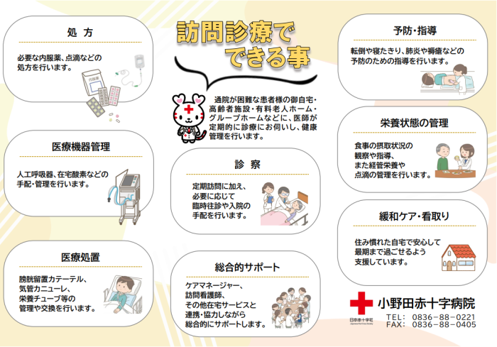 定期訪問に加え、必要に応じて臨時往診や入院の手配を行います。